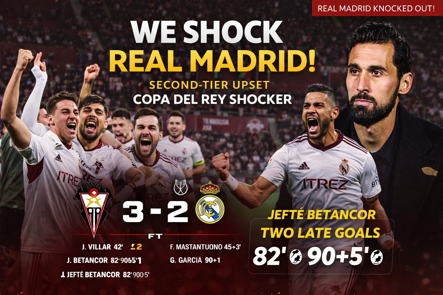 Albacete delivered one of the biggest shocks in recent Copa del Rey history after eliminating Real Madrid with a dramatic 3–2 victory, knocking the Spanish giants out of the competition at the hands of a second-tier side.