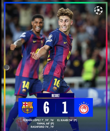 - Final Score: Barcelona 6–1 Olympiacos