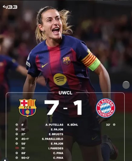 Barcelona Femení delivered a statement performance in the UEFA Women’s Champions League (UWCL), dismantling Bayern Munich 7–1 at the Estadi Johan Cruyff. The reigning champions showcased their trademark attacking brilliance, with captain Alexia Putellas leading the charge in a breathtaking display of footballing dominance.