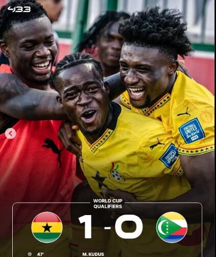 Ghana’s national football team, the Black Stars, have officially qualified for the 2026 FIFA World Cup after a hard-fought 1–0 victory over Comoros in the CAF World Cup Qualifiers. The crucial goal came in the 47th minute from Mohammed Kudus, the shining star of Ghanaian football, sending fans into jubilation across the nation.