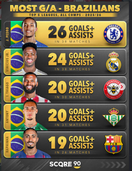 João Pedro is enjoying a breakout season in the Premier League, emerging as the Brazilian player with the most combined goals and assists (G/A) in the 2025/26 campaign. At just 24 years old, the Chelsea forward has racked up 26 goal contributions in 38 matches, putting him ahead of some of Brazil’s biggest stars.