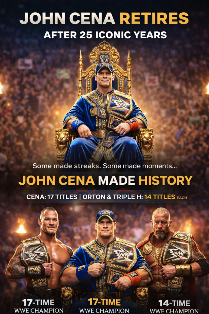John Cena has officially retired from professional wrestling after an incredible 25-year career, bringing an emotional close to one of the most influential eras in WWE history. His final match ended in defeat, but the result mattered little as the WWE Arena erupted in appreciation for a man who defined generations, broke records, and carried the company on his shoulders for decades.