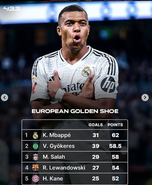 - Viktor Gyökeres (Sporting CP) – 39 goals in the Portuguese league. Despite scoring more goals than Mbappé, his total was weighted lower due to UEFA’s coefficient system, which values goals in Spain more highly than those in Portugal.