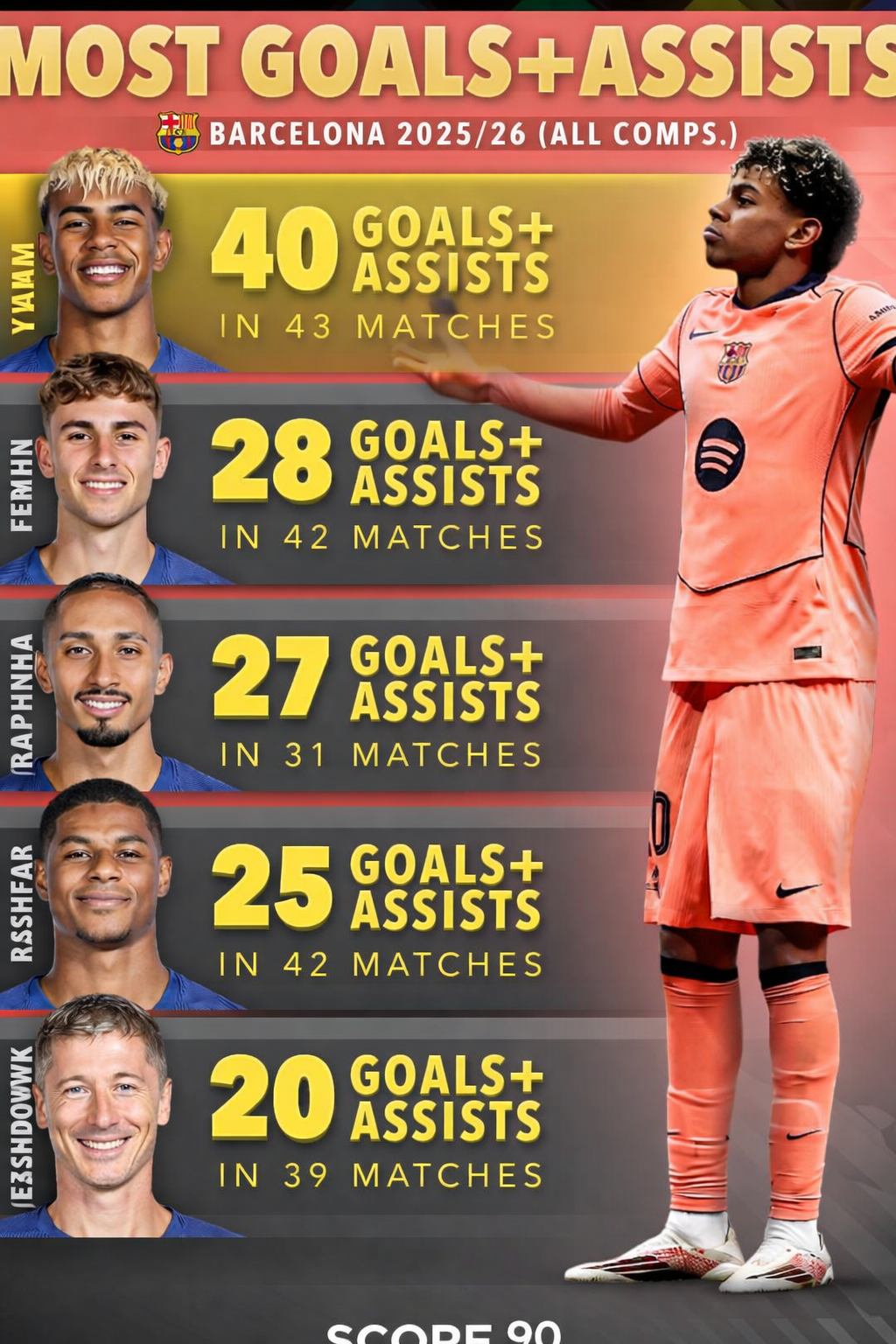 Barcelonaโs 2025/26 season has been defined by one nameโLamine Yamal. At just 18 years old, the young winger is not only impressing but leading the team in goals, assists, and total goal contributions.