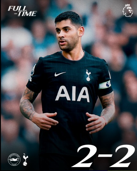 Brighton dominated early, scoring twice by the 31st minute. Richarlison pulled one back for Spurs, and a Jan Paul Van Hecke own goal in the dying minutes secured a 2-2 draw.