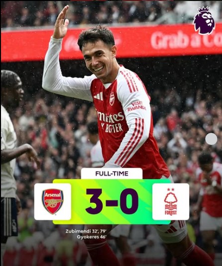 Arsenal continued their strong start to the season with a commanding 3-0 victory over Nottingham Forest. New signing Martín Zubimendi opened the scoring with a powerful header, marking his first goal for the club. Viktor Gyökeres added a second, and Zubimendi sealed the win with his second goal of the match.