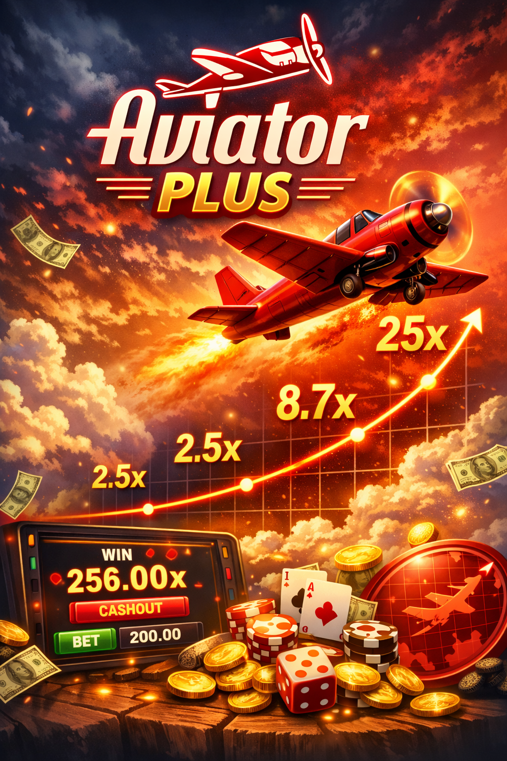 Aviator Plus is a multiplayer social gambling game consisting of an increasing curve that can crash at any time. When the round starts, a plane takes off, and the multiplier (the “odds”) begins to climb from 1.00x upwards.