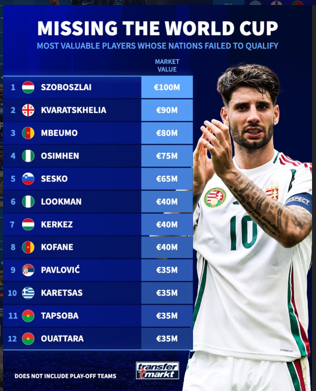 The combined market value of the players who failed to qualify is staggering. At the top of this list is Hungary’s midfield maestro Dominik Szoboszlai, valued at €100M. He is joined by other high-profile names whose market valuations reflect their status as world-class talents: