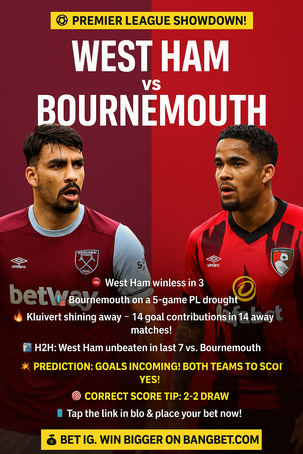 This fixture may not affect the top or bottom of the table, but it holds plenty of intrigue. Both West Ham and Bournemouth need a result to restore pride and positivity. For fans and bettors in Kenya, it’s a perfect Saturday pick – and with Bangbet, the excitement goes far beyond the final whistle.