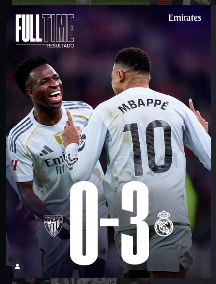 Real Madrid delivered a statement victory at San Mamés, dismantling Athletic Club 3–0 in a performance powered by Kylian Mbappé’s brilliance. With a brace and an assist, the French superstar once again proved why many are calling 2025 “the year of Mbappé.”