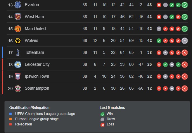Once a symbol of English football dominance, Manchester United’s 2024–25 campaign was a disaster. Despite heavy investment and a squad full of international stars, United barely avoided relegation. Their Europa League final loss to Tottenham only added salt to the wound. Fans and pundits alike criticized the lack of cohesion, poor defensive structure, and underwhelming performances from key players like Bruno Fernandes and Marcus Rashford.