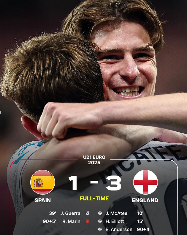 England’s U21 side delivered a statement performance in the UEFA European Under-21 Championship quarterfinals, defeating Spain 3-1 in a rematch of the 2023 final. Goals from James McAtee, Harvey Elliott, and Elliot Anderson powered the Young Lions into the semifinals, where they will face the Netherlands.