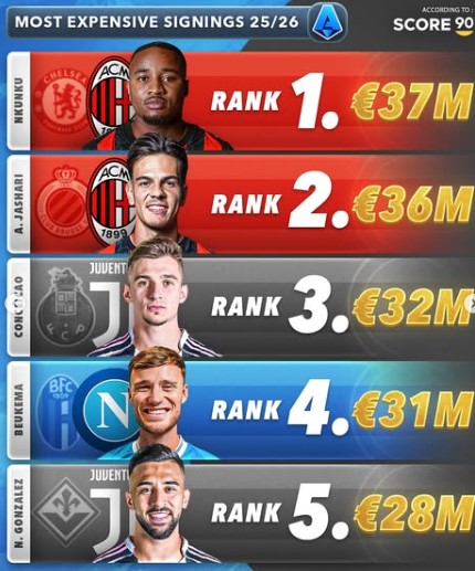 Serie A clubs focused on value-driven signings, targeting emerging talent and tactical fits. AC Milan topped the Italian spending chart with two key acquisitions costing €37 million and €36 million respectively, aimed at bolstering their midfield and attacking options.