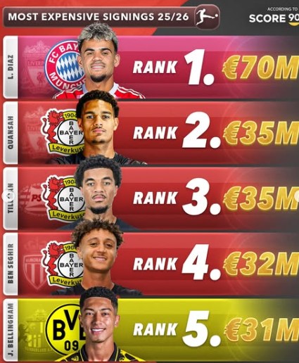 Bayer Leverkusen followed with a trio of signings from England, each costing between €32 million and €35 million, reinforcing their midfield and attacking lines. Borussia Dortmund also made a notable €31 million investment in a rising star, continuing their tradition of nurturing young talent.