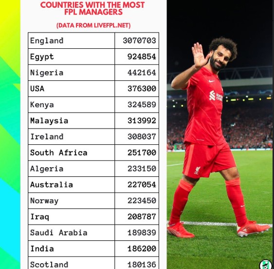 • Egypt’s surge (924,854 managers) is strongly linked to the influence of Mohamed Salah, Liverpool’s superstar, who is one of the most popular FPL captains worldwide.