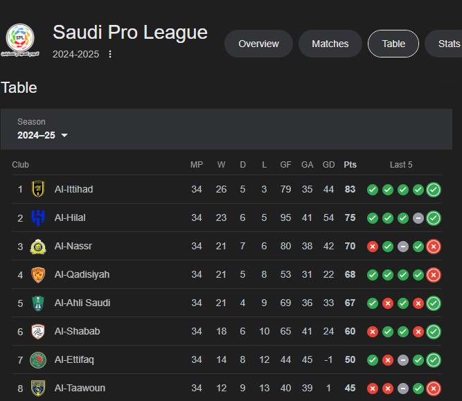 Al Hilal, last season’s champions, started strong but faltered in the final weeks. Despite boasting a squad featuring Sergej Milinković-Savić and Neymar(who left), they couldn’t maintain consistency. Their 75 points secured second place, but their inability to defeat Al Ittihad in key matches proved costly.