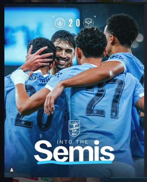 Manchester City booked their place in the Carabao Cup semi-finals with a controlled 2–0 victory over Brentford at the Etihad Stadium on Wednesday night, as goals from Rayan Cherki and Savinho capped a professional performance from Pep Guardiola’s rotated side.