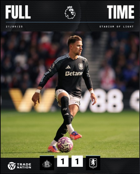 Sunderland vs Aston Villa ended in another 1-1 draw, but the story was Sunderland’s resilience. Reduced to 10 men, the newly promoted side still managed to equalize. They now sit an impressive 7th in the Premier League table.