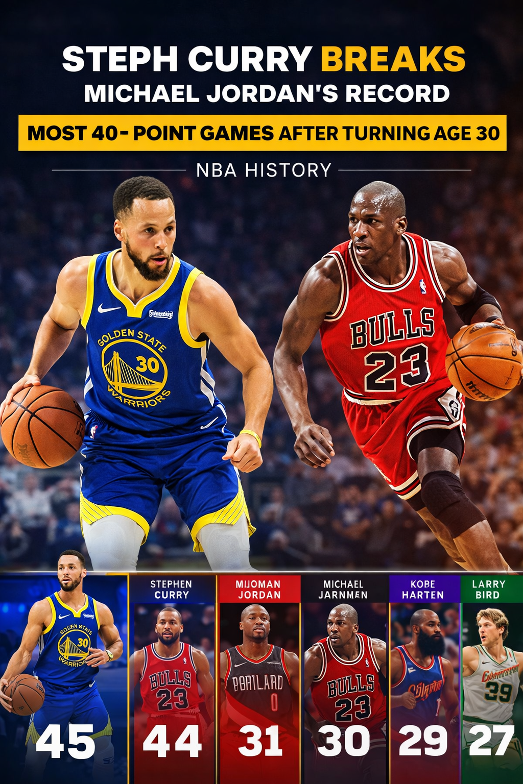 The Golden State Warriors superstar has officially surpassed Michael Jordan for the most 40-point games after turning 30, setting a new benchmark in NBA history and further cementing his legacy as one of the greatest scorers the league has ever seen.