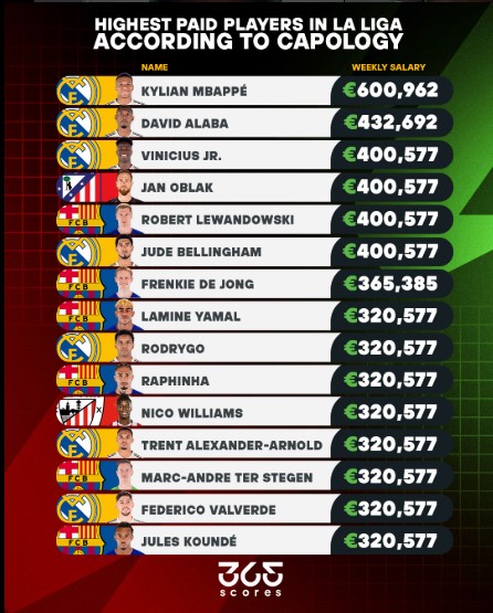 The updated list of the highest-paid players in La Liga, according to Capology, underscores the leagueโ€™s ongoing status as a premier destination for world-class footballers. With weekly wages reaching as high as โ‚ฌ600,962, Spanish football continues to invest heavily in elite performance, brand growth, and competitive dominance.