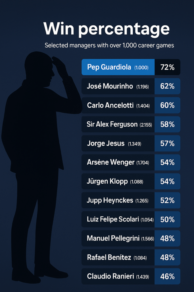 These figures represent cumulative win rates across massive sample sizesโeach manager has coached over 1,000 competitive fixtures, making the percentages both credible and statistically significant.