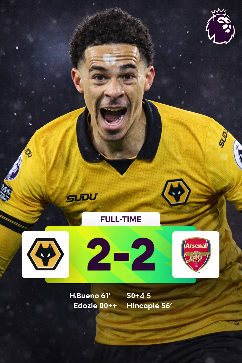 Arsenal surrender a two-goal lead as Wolves fight back to earn a dramatic 2–2 draw at Molineux. Tom Edozie’s debut goal and Calafiori’s own goal dent Arsenal’s title hopes.