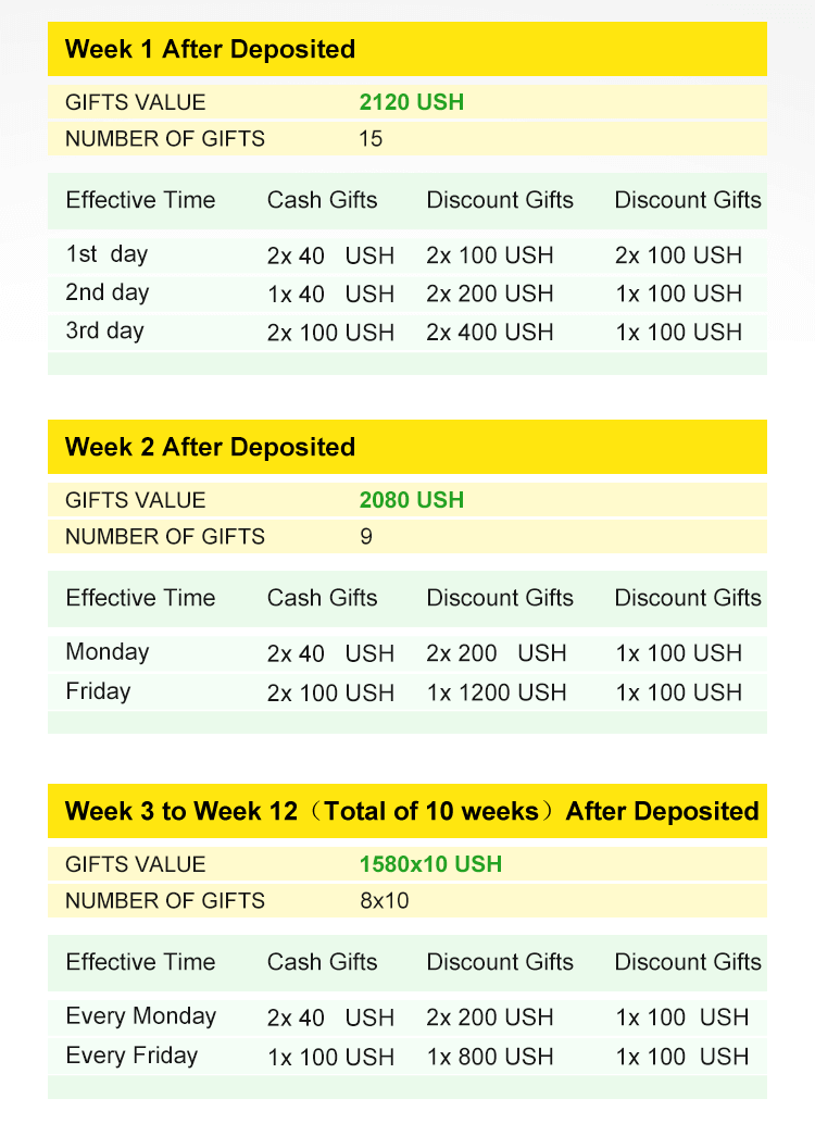 ③All Gifts are spread out for usage for a period of 12 weeks, but you will receive all the Gifts once you make the first deposit of 1000 USH.